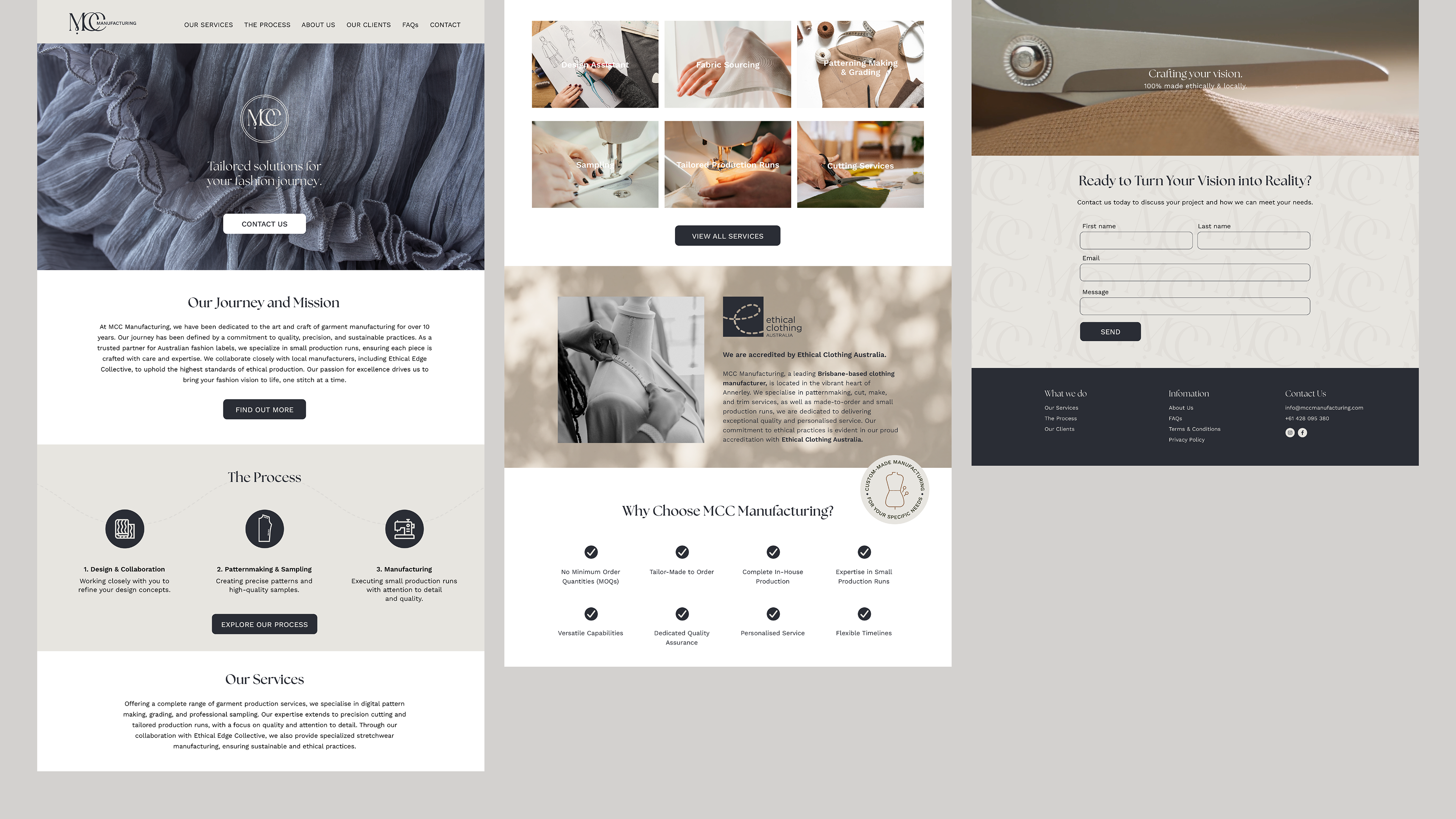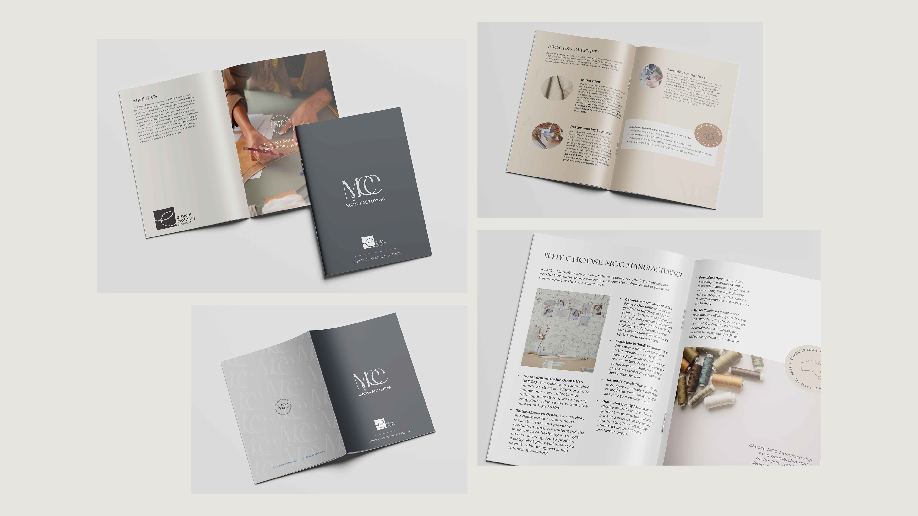 A cohesive branding package was created for MCC Manufacturing, a leading garment production company in Annerley, Brisbane. The project included logo design, lookbook design, business card, brand guidelines, and website design. The branding reflects MCC Manufacturing's mission to deliver high-quality, sustainable, and ethically produced garments for emerging and established fashion labels, emphasising their commitment to quality and innovation while ensuring a seamless connection between their identity and client expectations.